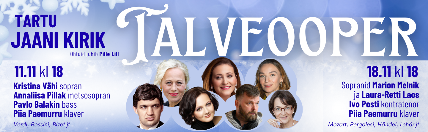 Tartu Jaani kirik 18.11 kell 18 TALVEOOPER 2025 Sopranid Marion Melnik ja Laura-Retti Laos, Ivo Posti (kontratenor), Piia Paemurru (klaver) Kavas: Mozart, Pergolesi, Händel, Lehár jt. Piletid hinnaga 20/12€ on saadaval PILETILEVIS ja kohapeal enne kontserdi algust!